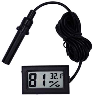 Простой и удобный гигрометр для инкубатора. Показывает влажность воздуха, а также температуру. Точность показаний влажности: до 1%. Точность показаний температуры до 0,1°С. Питание: 2 батареи LR44 (входят в комплект). Гигрометр имеет выносной щуп. Вес: 45 грамм
