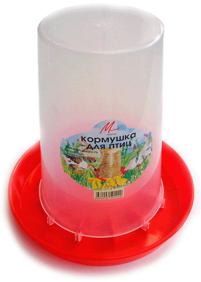 Кормушка для птиц и цыплят бункерная (объем бака 3 литров); Принцип действия: как только уровень корма снижается в кормушке, свежий корм тут же поступает в кормушку из банки; Особенность: птица (куры, утки, гуси, перепела) получают корм свежим, исключено разбрасывание корма лапами, экономится время птицевода Вес: 250 грамм.